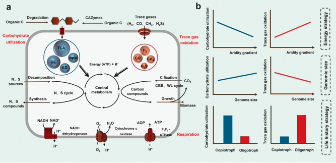 在这项研究中,我们沿着自然干旱梯度收集了土壤样本,通过利用宏基因组测序衍生的微生物基因组与培养实验相结合的方法系统地研究了自然干旱梯度上土壤微生物群落的生态进化策略。我们的结果表明最普遍的微生物是代谢通用的好氧菌,它们可以利用多种能源来支持有氧呼吸、碳固定以及N、P和S循环。在更干旱的生境中土壤微生物表现出与能量消耗减少相关的基因组特征,包括更小的基因组大小、更低的GC含量和更少的16S rRNA基因拷贝数。随着干旱程度的增加,微生物对有机能量的利用降低,而对大气痕量气体氧化的依赖增加,这种能源利用的转变与土壤有机碳含量的下降密切相关。随着有机碳沿干旱梯度的降低,痕量气体氧化微生物(专一痕量气体氧化微生物和多种痕量气体氧化微生物)的丰度显著增加,而非痕量气体氧化微生物的丰度则下降。此外,利用痕量气体氧化作为能源的微生物主要是基因组较小的寡营养微生物。相比之下,具有较大的基因组大小的富营养微生物在有机能源利用中占主导地位。
