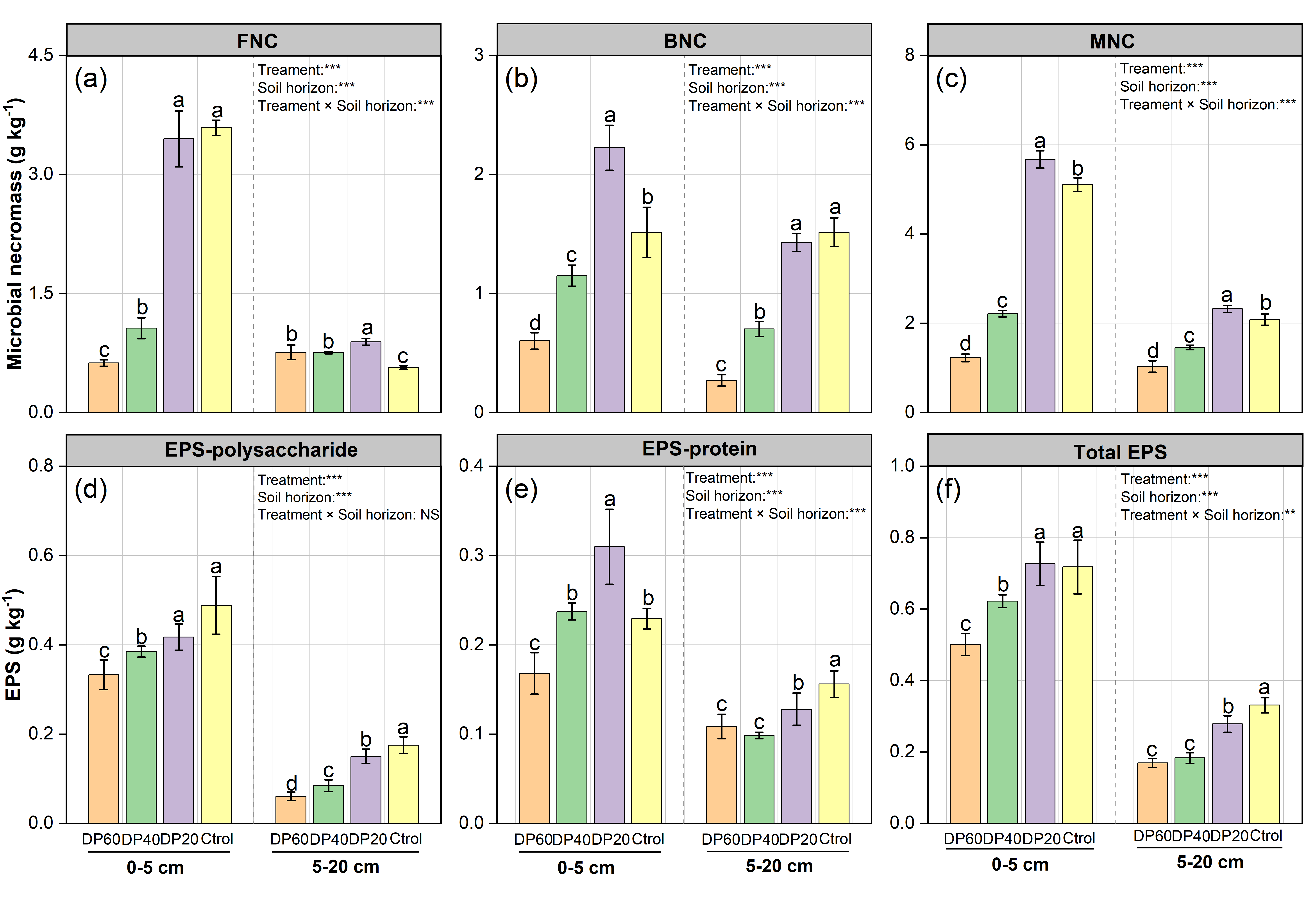 图2 干旱处理对微生物残体(a-c)和胞外聚合物(d-f)的影响