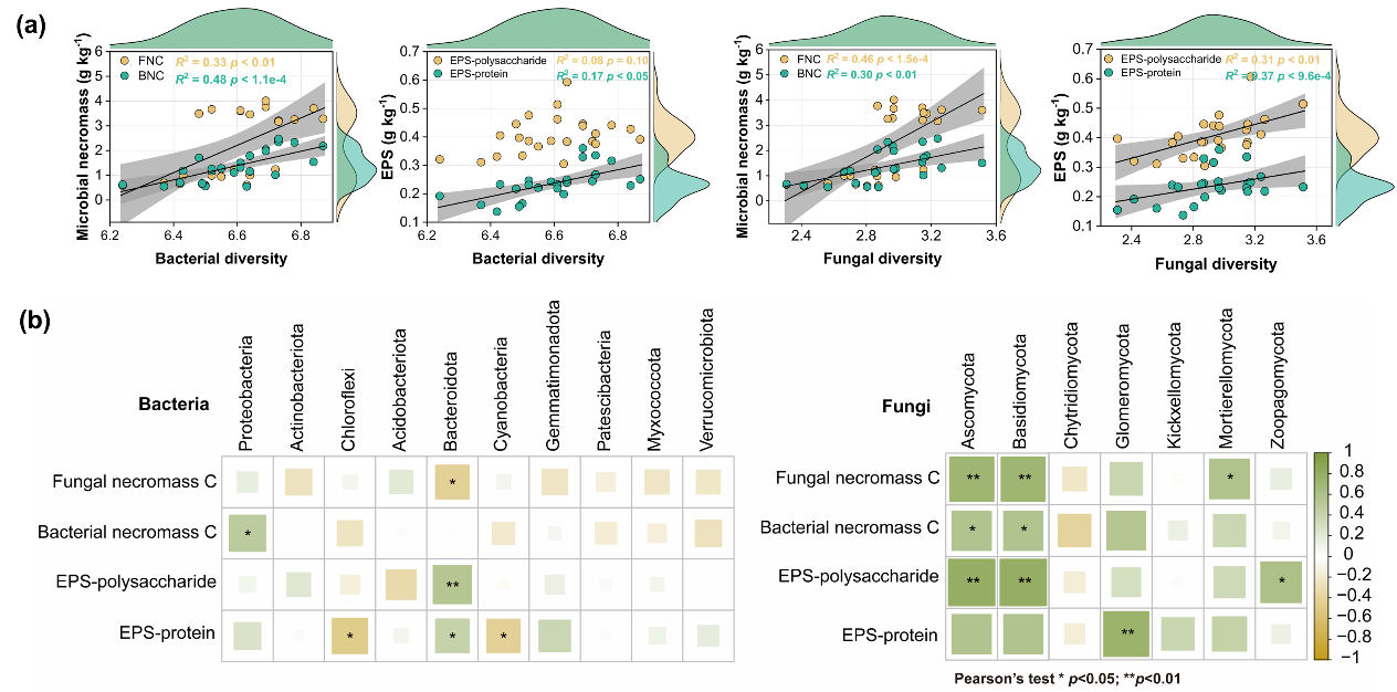 图3 微生物多样性与残体及胞外聚合物含量的线性驱动关系(a)和在门水平上微生物群落对微生物残体和胞外聚合物的潜在贡献(b)