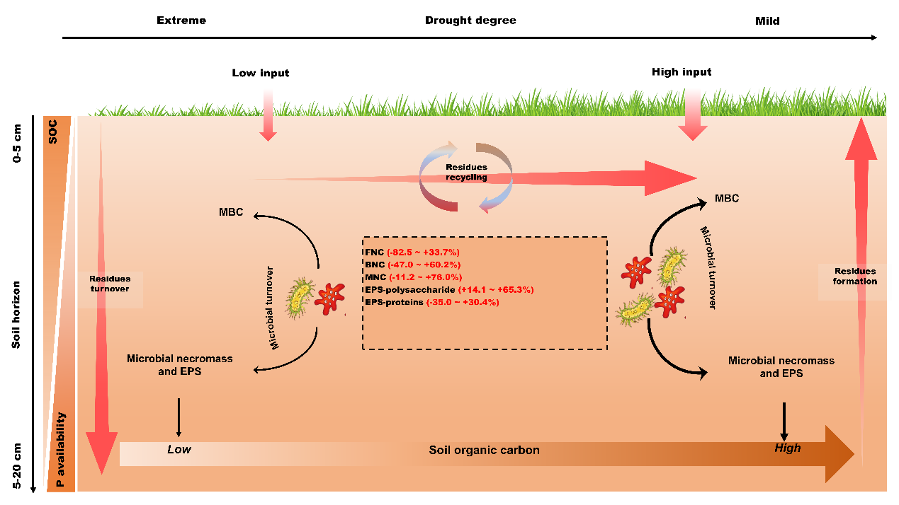 尽管微生物细胞壁残体是土壤有机碳的重要来源,但微生物在干旱胁迫下通过生理调整将碳转移到胞外聚合物的生成中,从而使其成为动态的土壤碳库。两者不同的形成和周转速率差异在预测干旱生态系统中 SOC 的动态变化方面造成了根本的不确定性。长期干旱条件下胞外聚合物和微生物细胞壁残体(基于氨基糖表征)的含量、它们对 SOC 积累的相对贡献以及调节它们的因素仍然缺乏明确的机制研究。