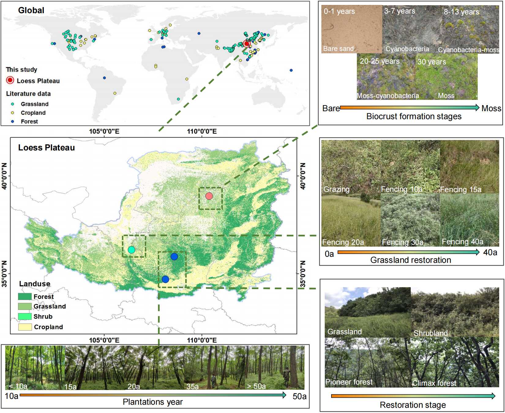 图1 全球和黄土高原典型生态系统样点分布