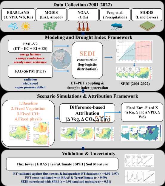 研究基于2001-2022年的多源观测数据,采用反事实模拟框架和标准化蒸散亏缺指数(SEDI),系统解析了植被结构、植被生理效应及气候背景对气象干旱的贡献。结果表明,真实植被情景下的SEDI变湿趋势(0.21/10a)是去植被趋势情景(0.11/10a)的两倍。真实植被情景下SEDI的变湿趋势(0.21/10 a)约为去植被情景(0.11/10 a)的两倍。其核心机制在于:植被对大气水分供给(蒸散发,ET)的贡献(17.83 mm/10 a)显著高于对大气水分需求(潜在蒸散发,PET)的贡献(9.02 mm/10 a),从而降低大气水分亏缺,缓解了区域气象干旱。