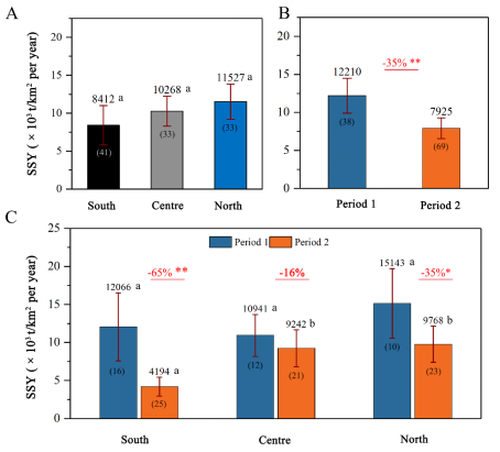 研究发现,近几十年来黄土高原小流域年均产沙模数(SSY)空间差异显著,变化范围为498-28,460 t/km2·a(图2)。在泥沙来源方面,沟道(包括沟床、沟坡及沟岸扩张)始终是主要的泥沙来源,其对流域总产沙量的平均贡献率约为64%,显著高于沟间地坡面(图3)。