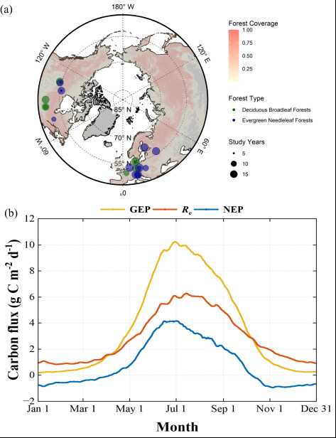 图1 北方森林(> 45°N; a)涡度相关监测点的空间分布与碳通量的季节变化(b)。