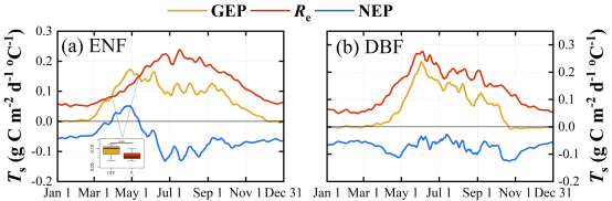 研究结果表明:初春期,常绿针叶林的NEP对温度波动呈正向响应,而落叶阔叶林则表现为负响应(图2)。在春季与夏季,随温度与饱和水汽压差的增加,总生态系统生产力(GEP)温度敏感性有降低趋势,而生态系统呼吸(Re)温度敏感性的变化则相对较小,导致NEP的温度敏感性也呈现降低趋势。