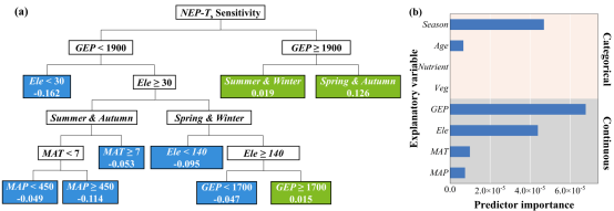 在春季,GEP与Re的温度敏感性均随站点生态系统生产力(年均GEP)的增加而增加,说明高温倾向于对生产力较低站点的光合固碳过程造成更强的负向影响。此外,幼龄和低养分可利用性森林的NEP温度敏感性呈现负值,说明幼龄与低养分可利用性森林的碳汇能力在面对温度上升时倾向于呈现负向响应。潜在影响因子中,站点生态系统生产力与季节是调控NEP温度敏感性的关键因子(图3)。