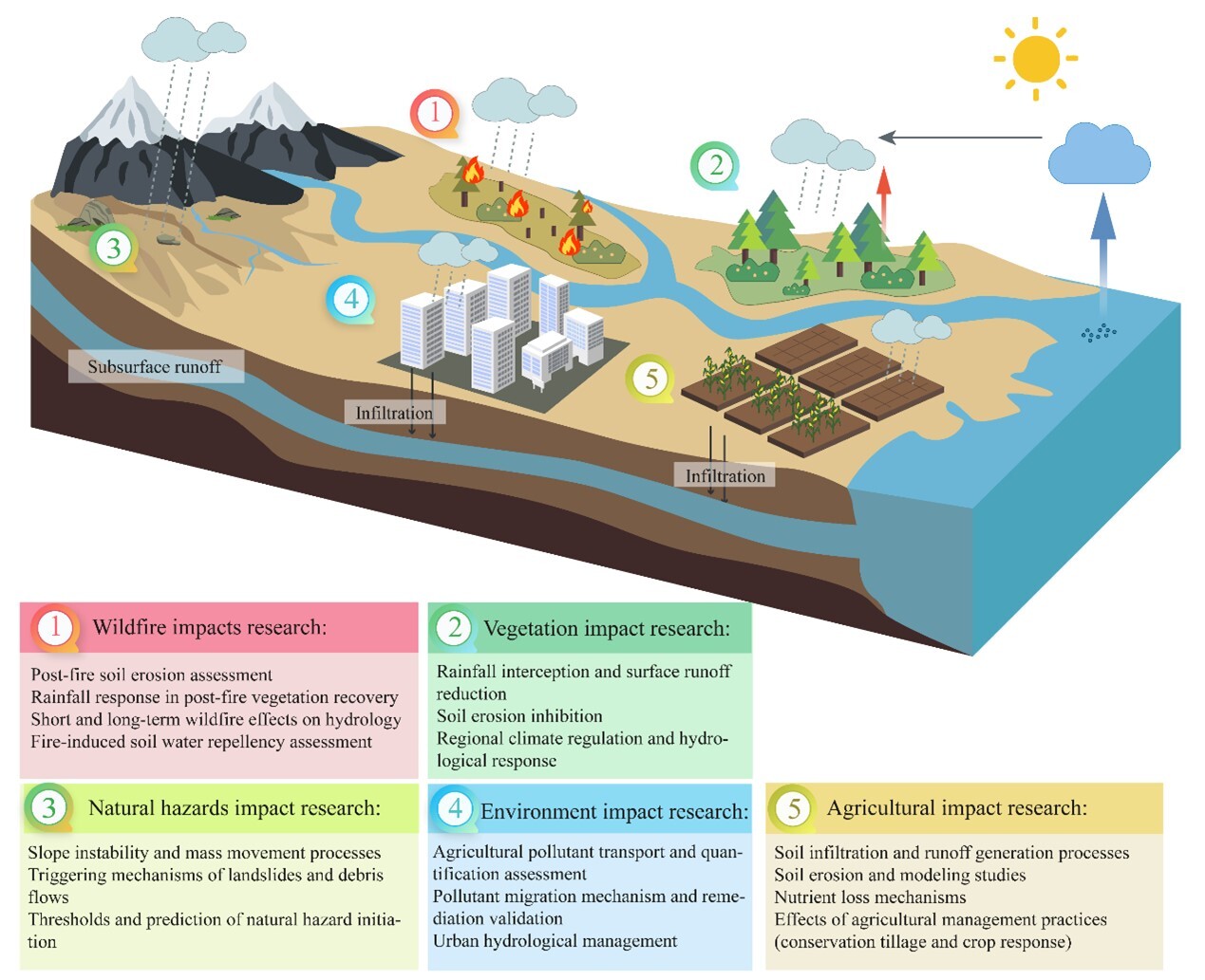 降雨模拟器是一种能够在可控条件下复现自然降雨关键特征的实验装置,作为分离降雨特性与地表响应的核心工具,已在土壤科学、水文学、地貌学和环境研究等领域得到广泛应用。本文系统回顾了降雨模拟器从早期异质化设计到复杂系统发展的技术进程,详细分析了不同类型降雨模拟器的特征、比较以及其在水文与土壤侵蚀研究中的应用。基于此,本文深入探讨了当前降雨模拟器研究中存在的局限与挑战,重点聚焦于模拟降雨雨滴特性与自然降雨间的差异,小尺度实验结果向流域或区域尺度推演时的尺度效应与不确定性,以及标准化过程中面临的挑战。