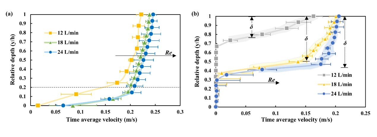 图2. 对照处理(a)与生物结皮处理(b)的流速轮廓线。注:h为床面至测点的距离,cm;H代表水流深度,厘米;h/H代表相对深度;Re代表雷诺数;黑色箭头表示Re的增加方向。