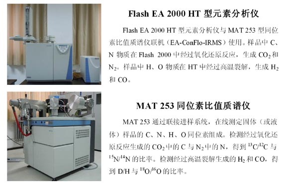 MAT 253稳定性同位素比值质谱仪由美国Thermo Fisher公司生产,配备有Flash EA 2000 HT型快速燃烧和高温裂解一体化元素分析仪及自动进样装置等附件。该仪器被广泛地应用于农学、林学、地学、食品质量检测等领域。可以精确测量质量在20 μg-20 mg的植物、动物、土壤、古代和现代沉积物等固体样品中的13C/12C,15N/14N,18O/16O和H/D稳定性同位素比值。